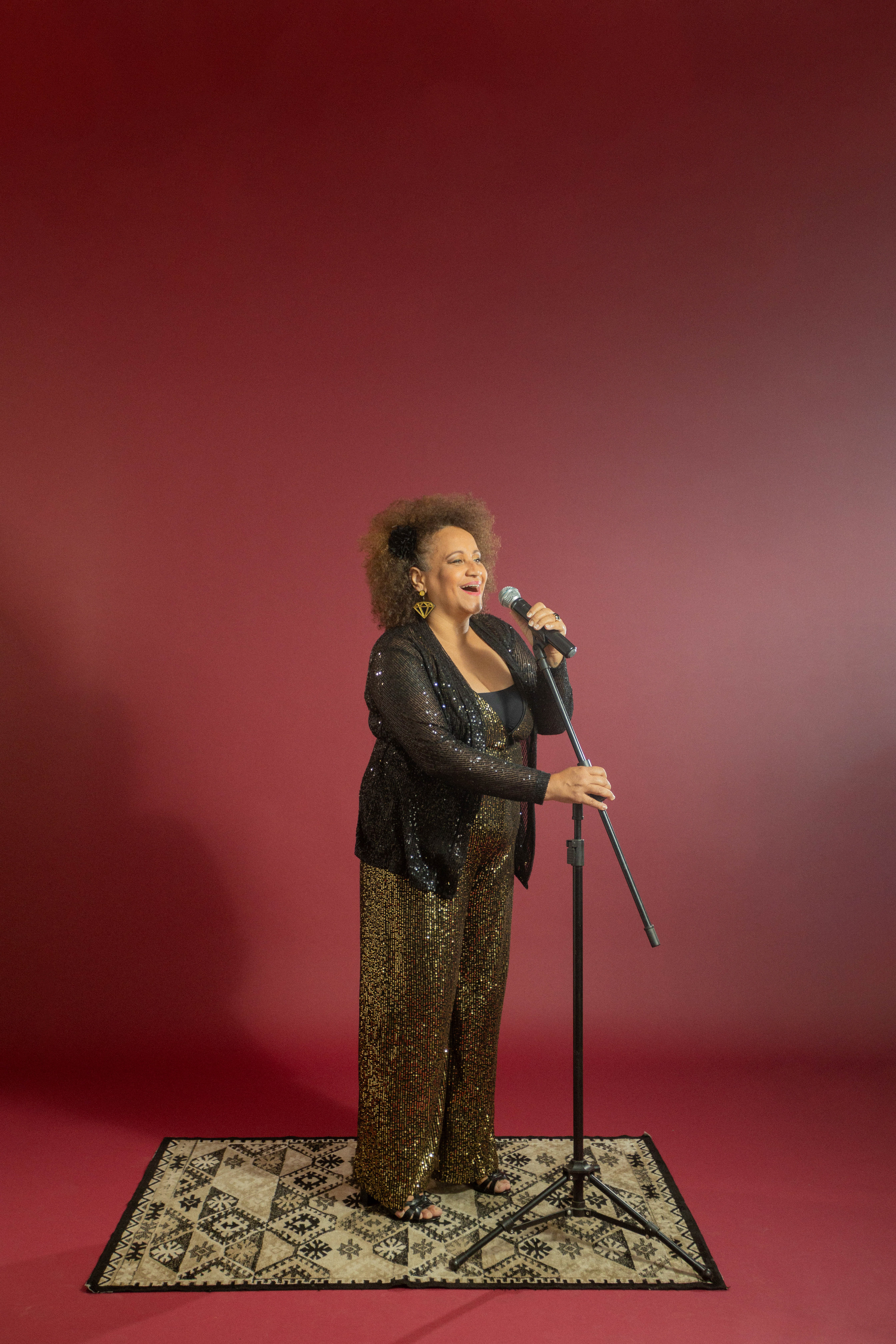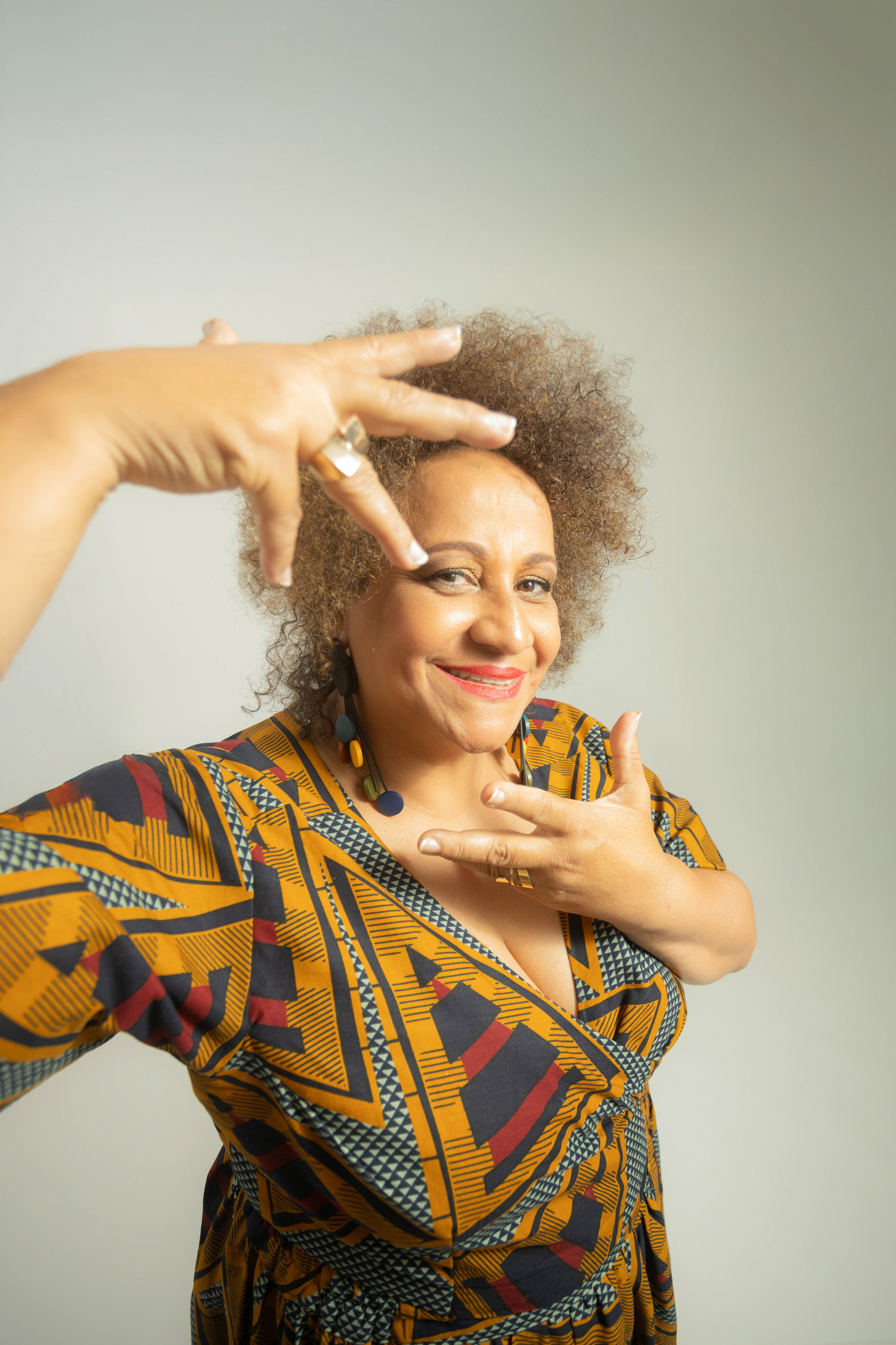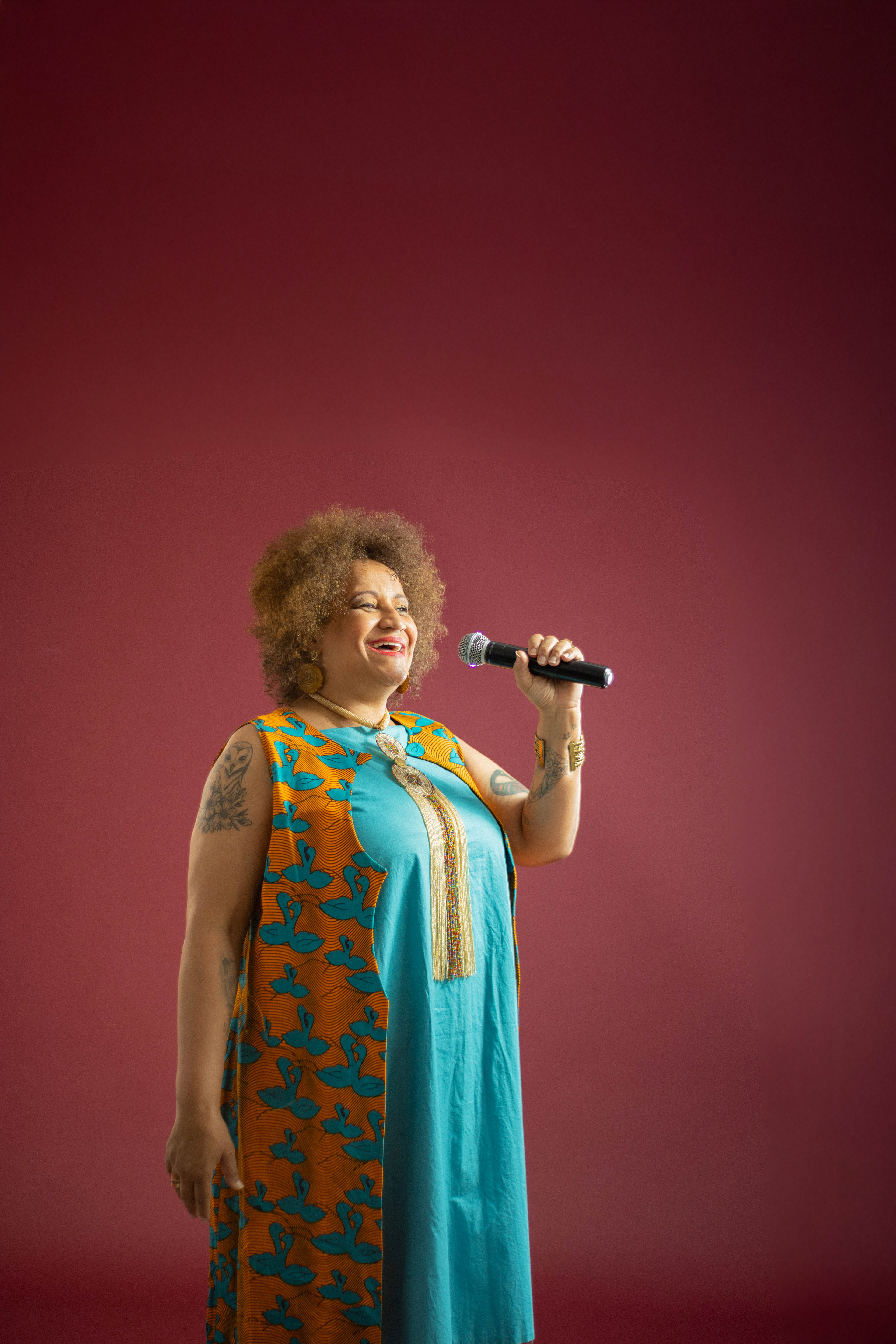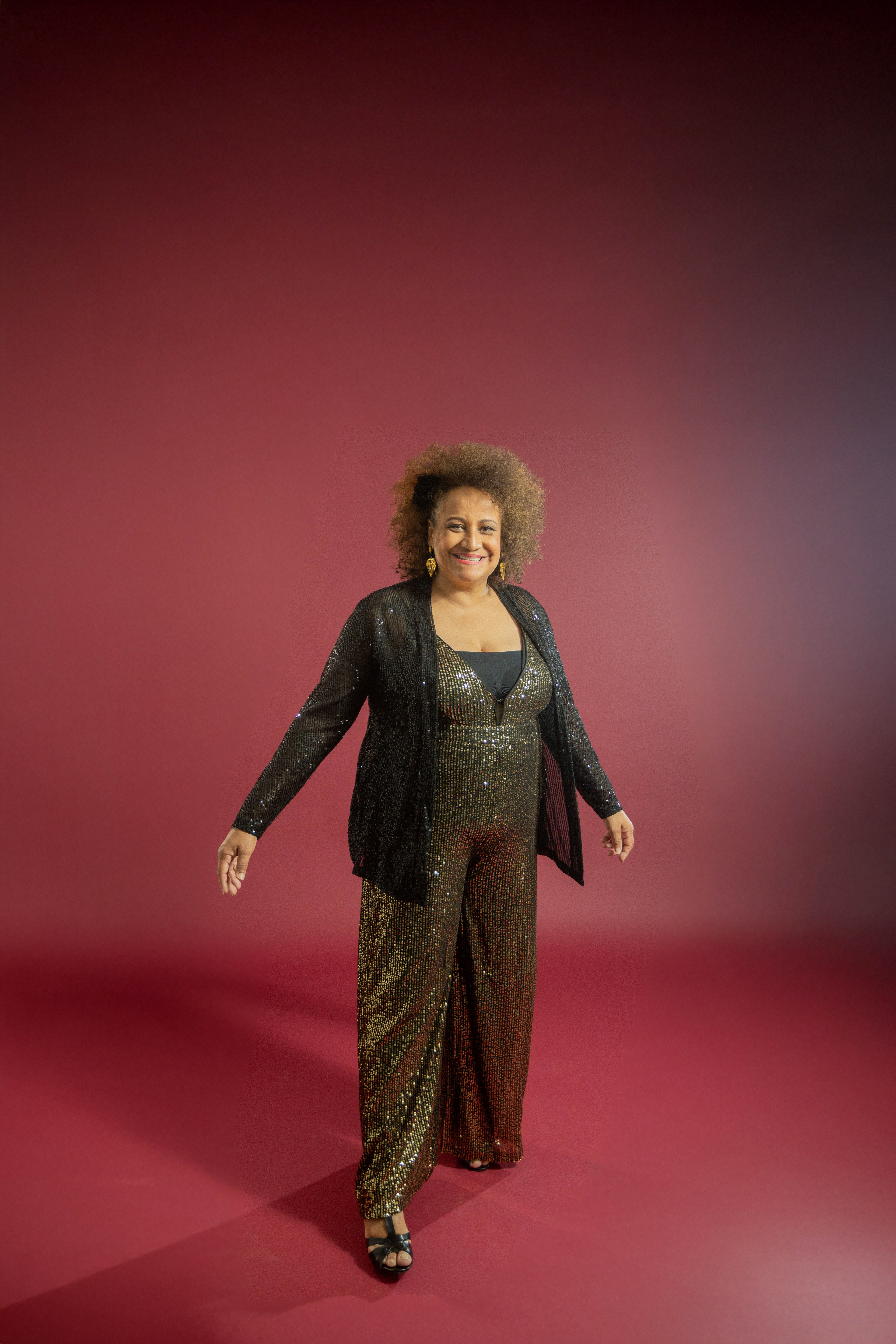 Utilizamos uma paleta de cores quentes e profundas, como o bordô, para emoldurar sua presença marcante. As fotos alternam entre o glamour das lantejoulas e a ancestralidade dos tecidos estampados, revelando uma artista que domina o espaço com um sorriso contagiante e uma elegância nata. É um registro que celebra a maturidade artística e a vibração de quem vive para a arte.