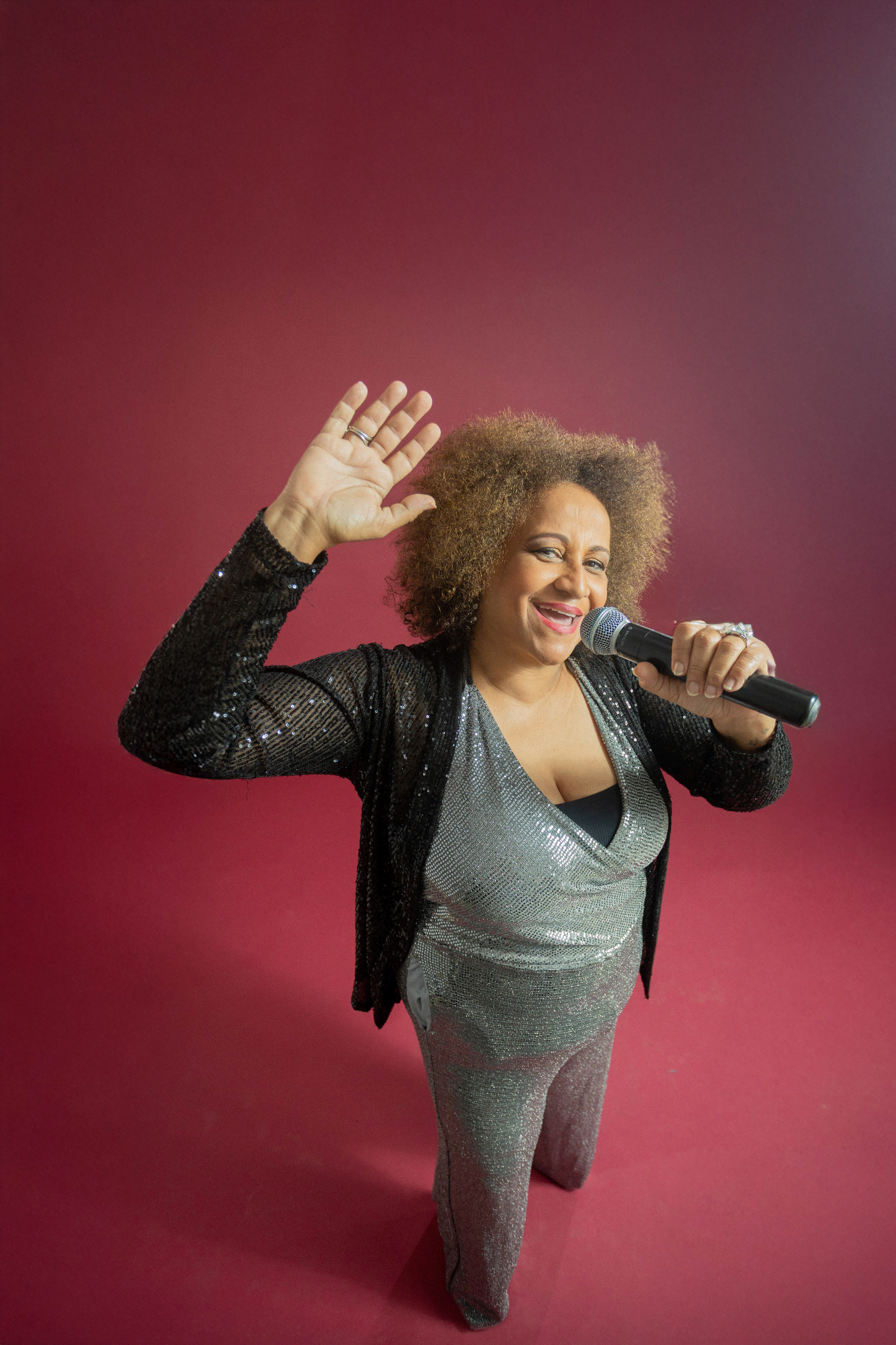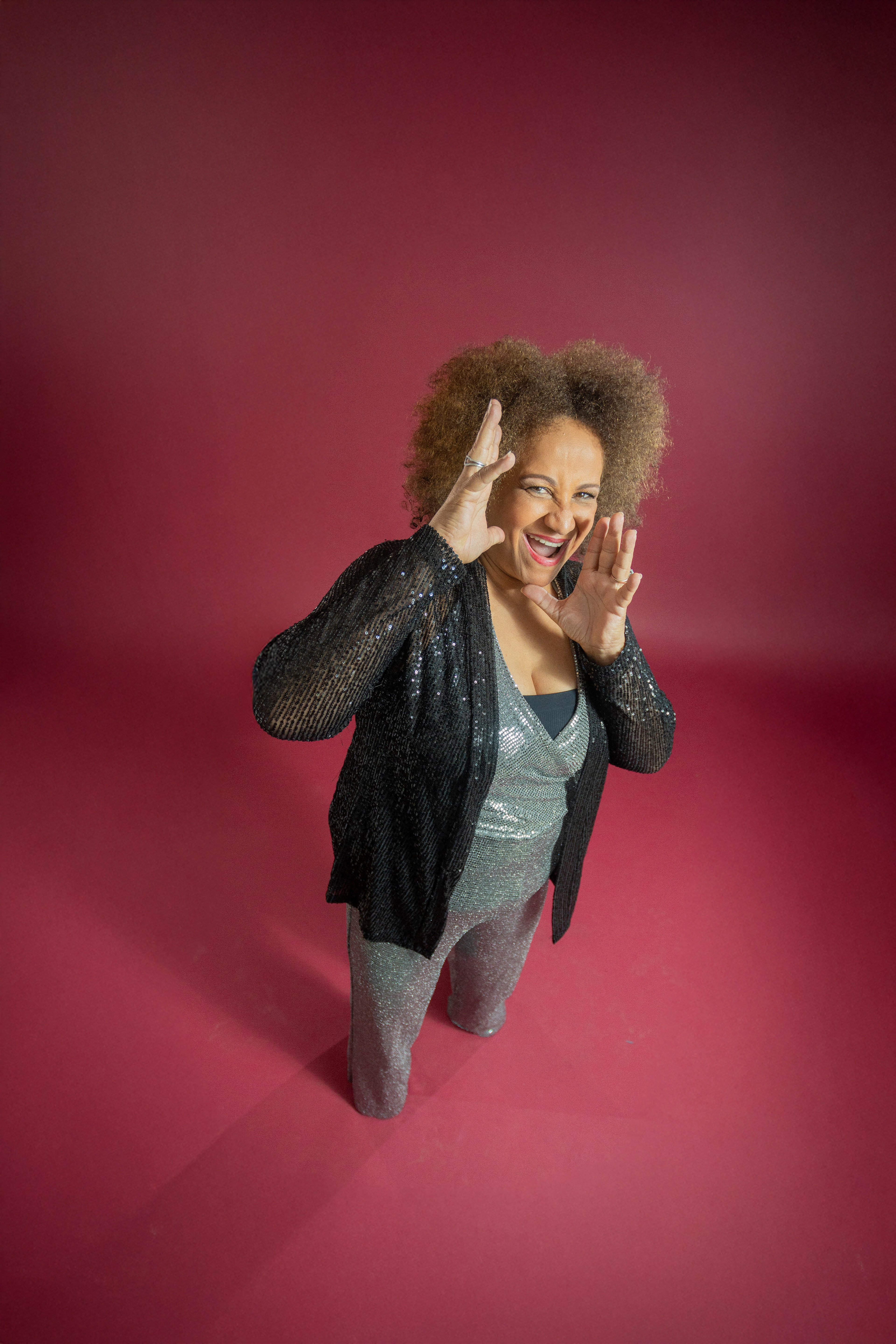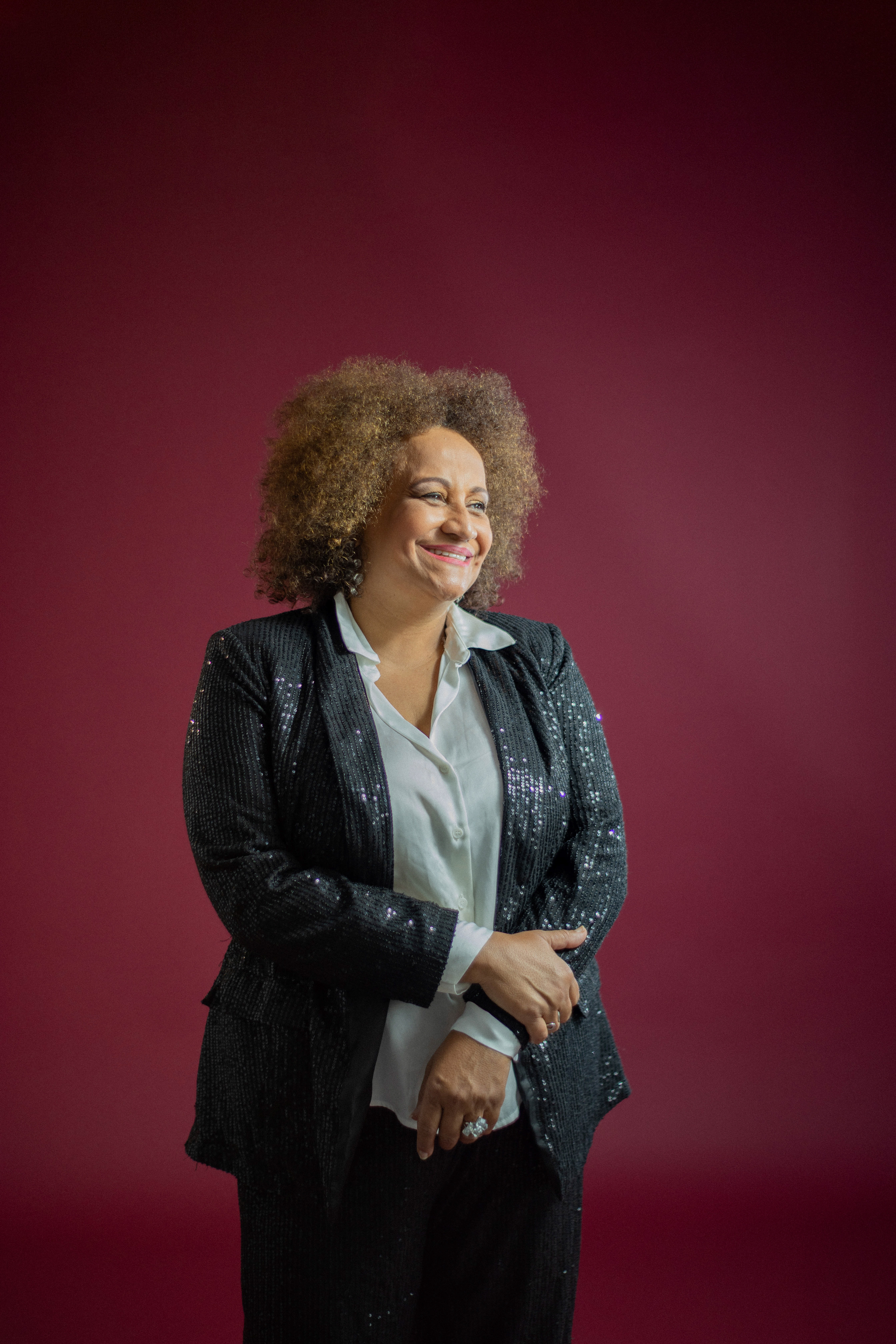 Utilizamos uma paleta de cores quentes e profundas, como o bordô, para emoldurar sua presença marcante. As fotos alternam entre o glamour das lantejoulas e a ancestralidade dos tecidos estampados, revelando uma artista que domina o espaço com um sorriso contagiante e uma elegância nata. É um registro que celebra a maturidade artística e a vibração de quem vive para a arte.