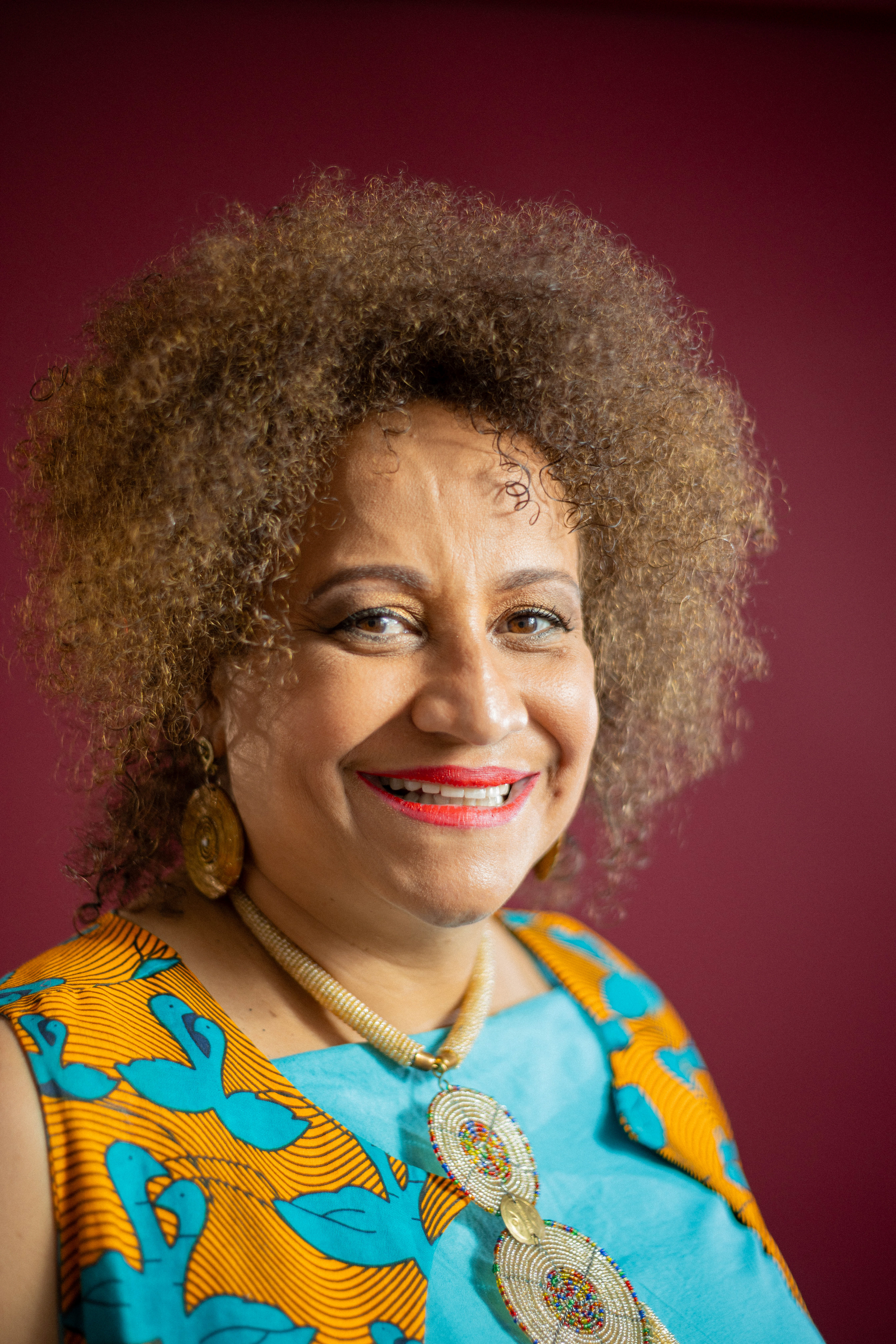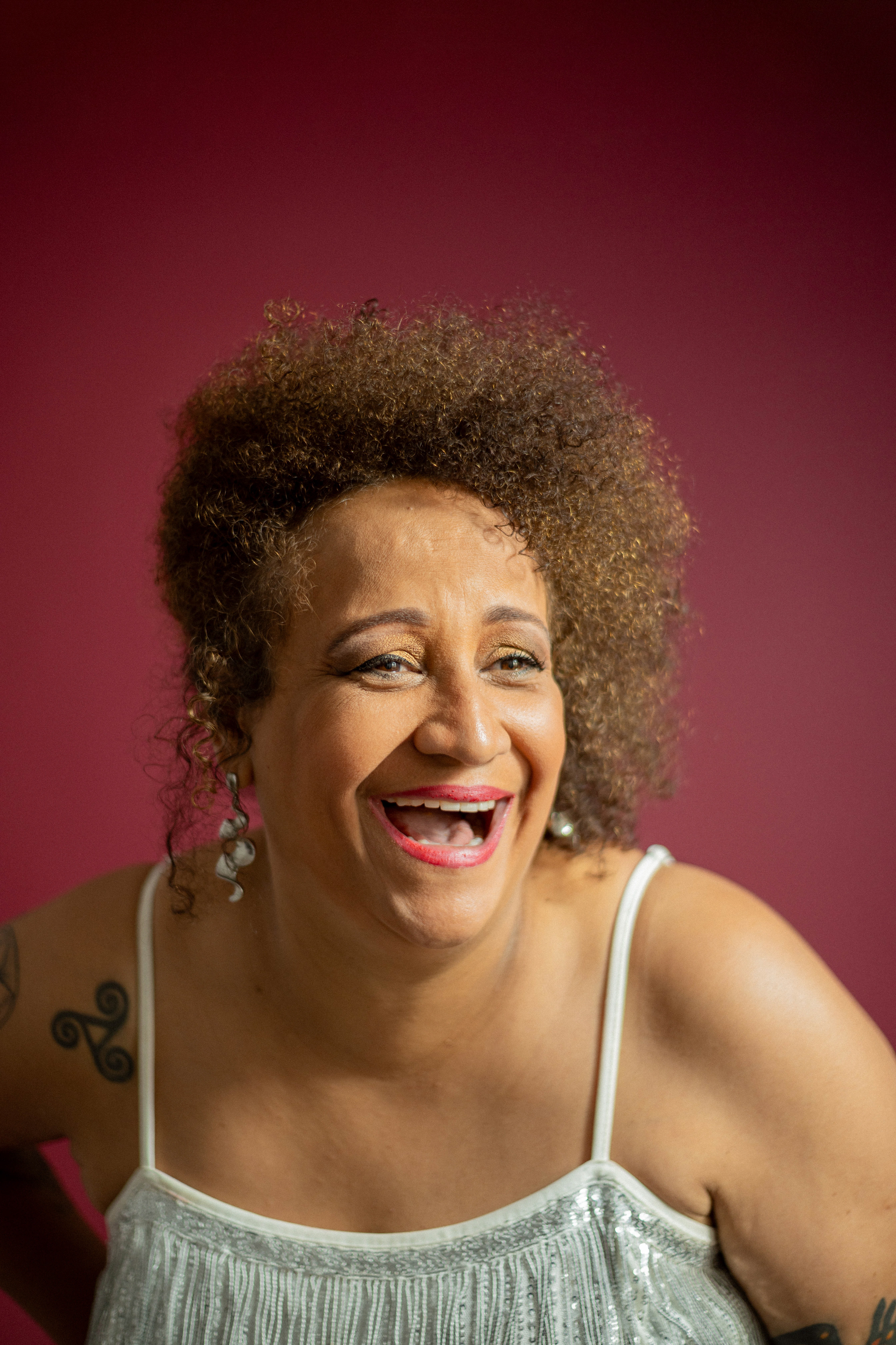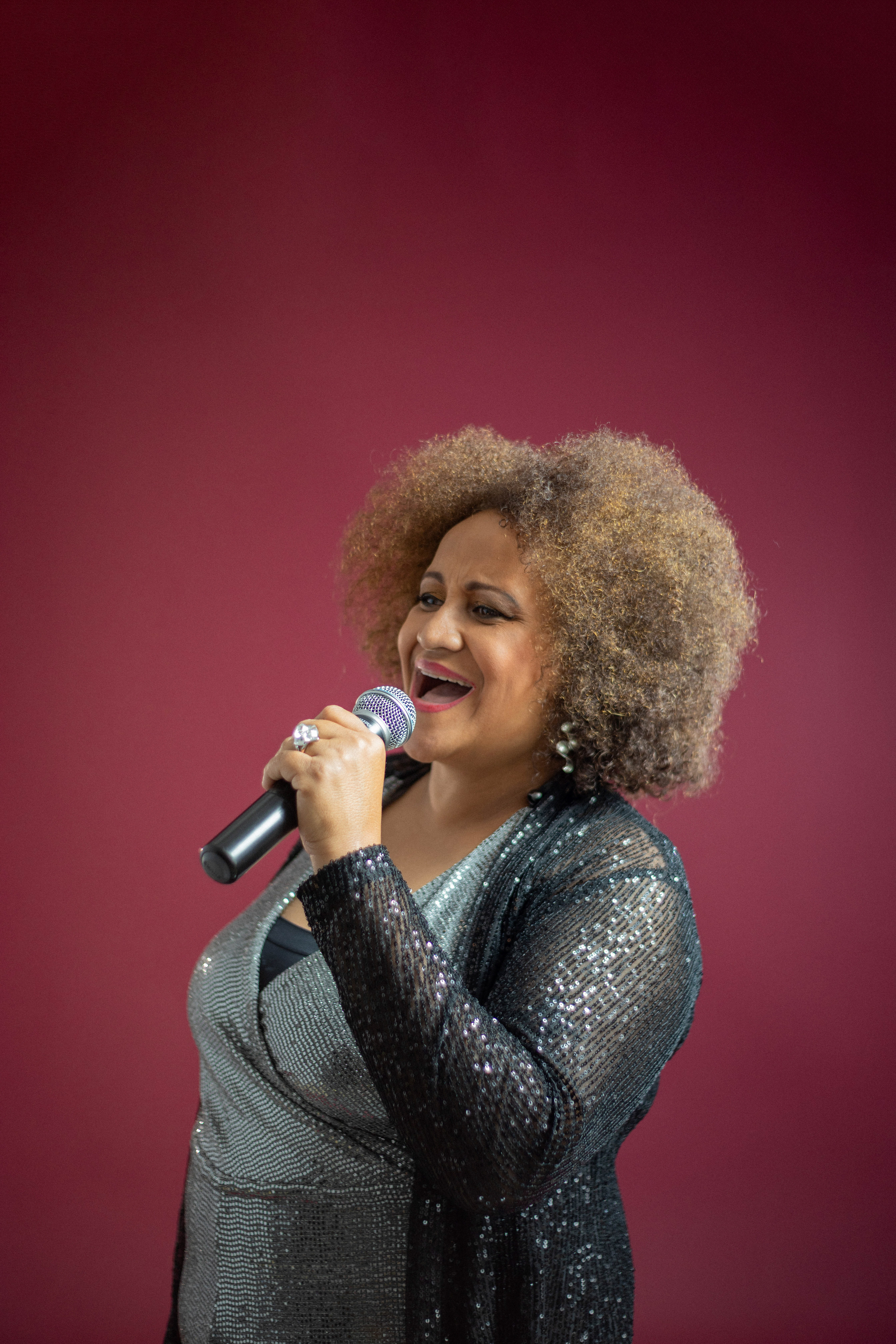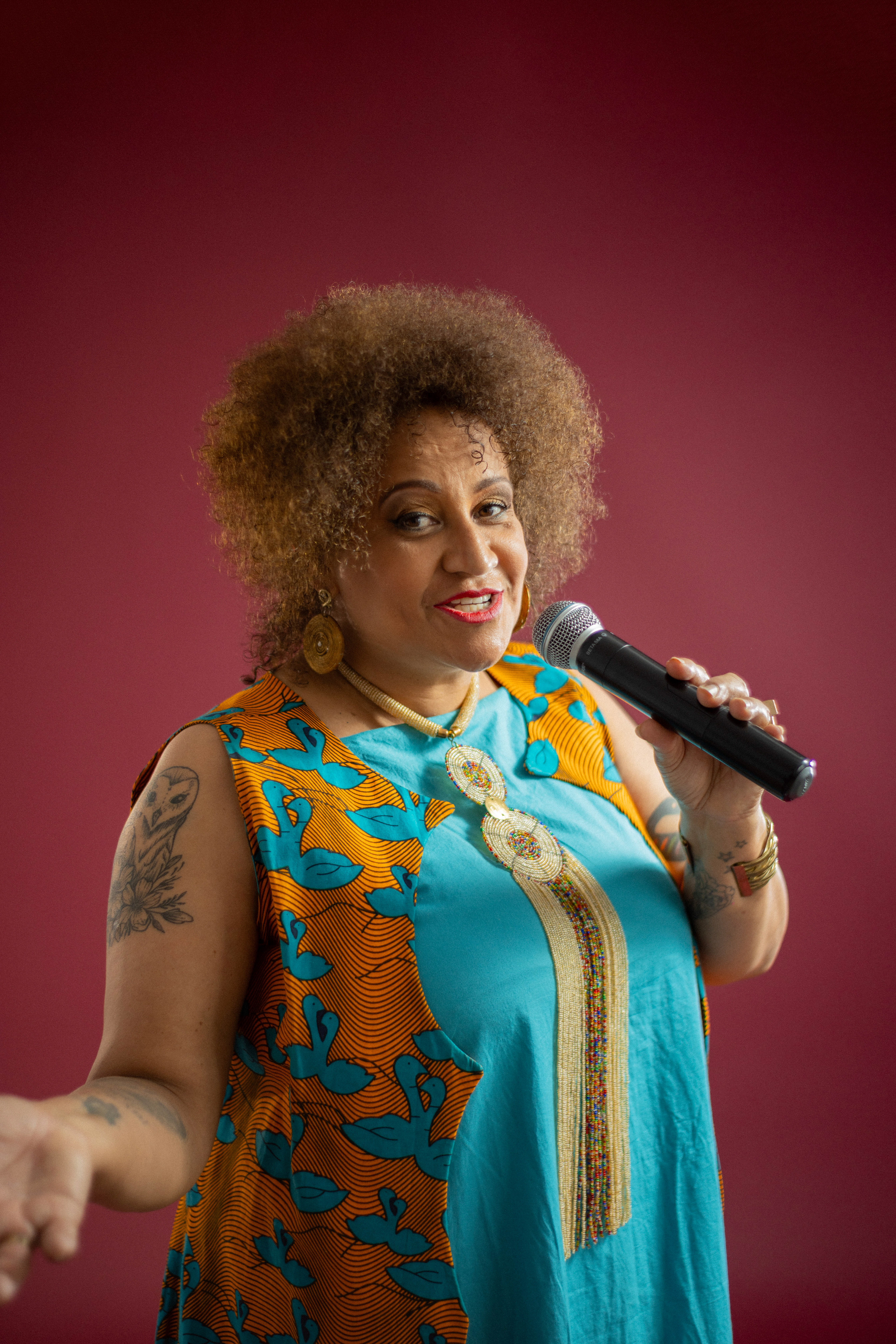 Utilizamos uma paleta de cores quentes e profundas, como o bordô, para emoldurar sua presença marcante. As fotos alternam entre o glamour das lantejoulas e a ancestralidade dos tecidos estampados, revelando uma artista que domina o espaço com um sorriso contagiante e uma elegância nata. É um registro que celebra a maturidade artística e a vibração de quem vive para a arte.